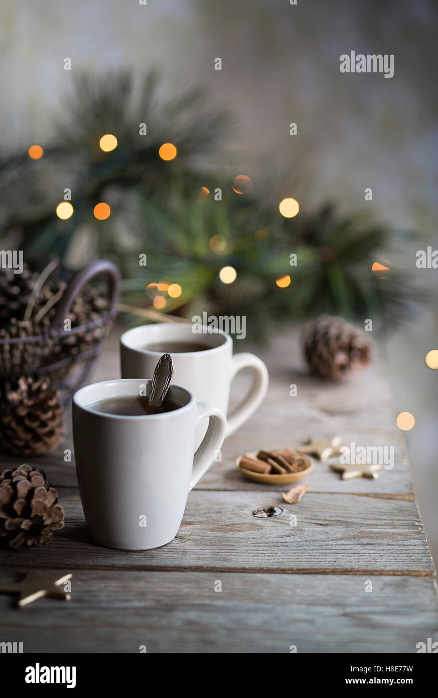 Christmas Rustic Table With Cups Of Tea And Decorations Stock