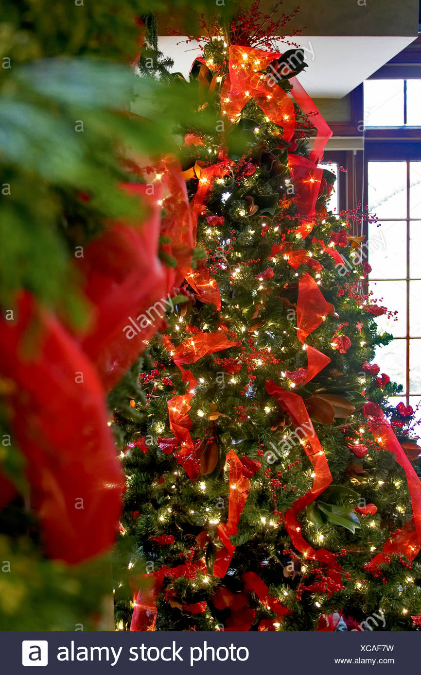 Decorated Christmas Tree With Red Ribbon And Lights Canada
