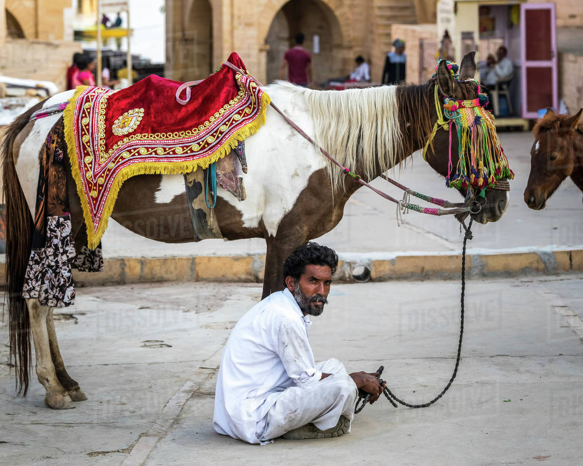 A Man Sits On The Ground With His Decorated Horse Standing Beside