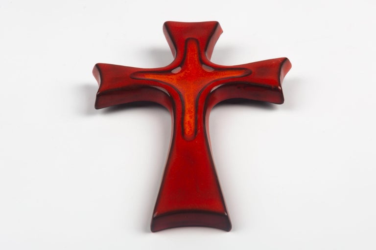 Midcentury European Wall Cross Red Glazed Ceramic Handmade
