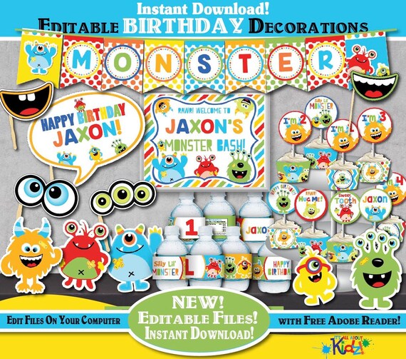 Editable Monster Birthday Decorations Self Editing Monster Etsy