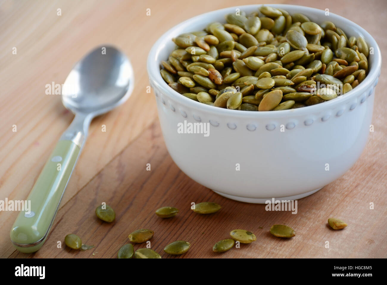 Roasted Pumpkin Seeds In White Decorative Bowl With Green Spoon On