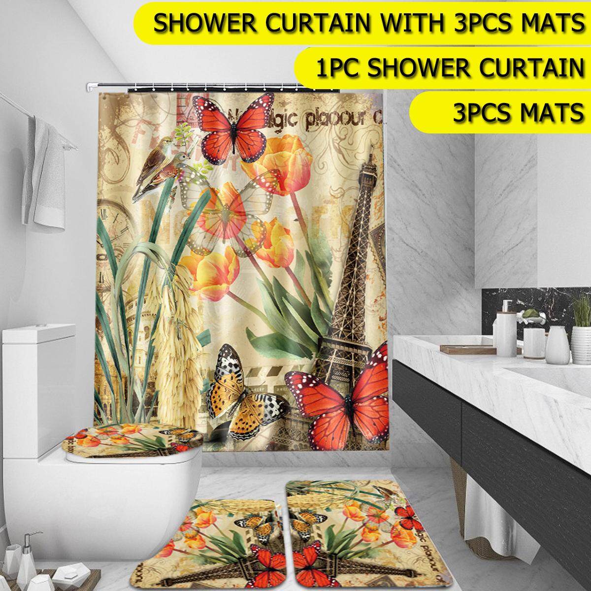Flower Butterfly Non Slip Bathroom Set Waterproof Shower Curtain