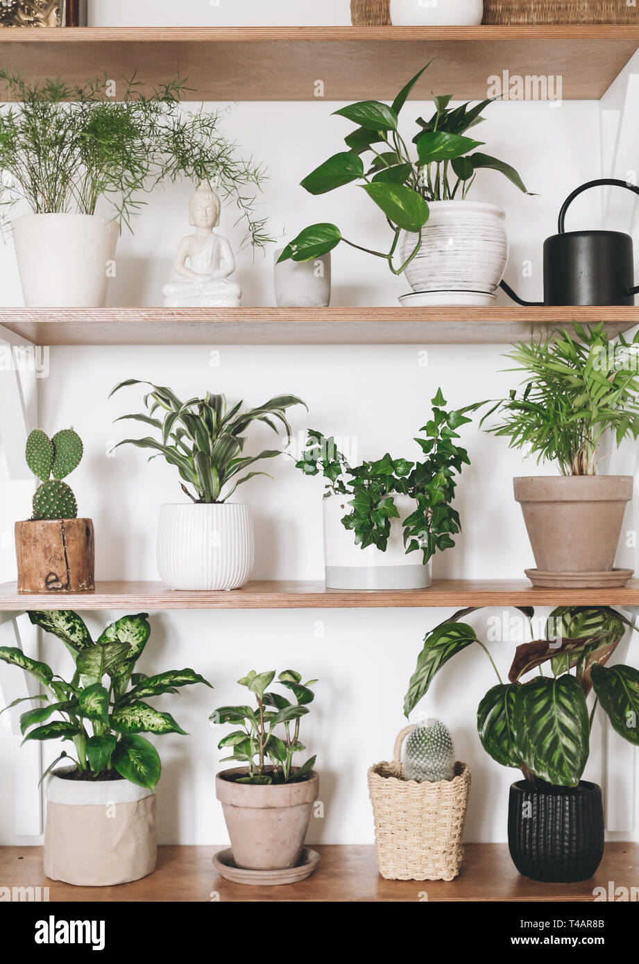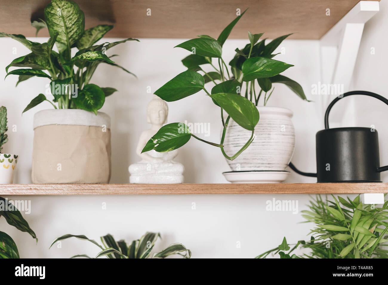 Stylish Wooden Shelves With Modern Green Plants And White Watering