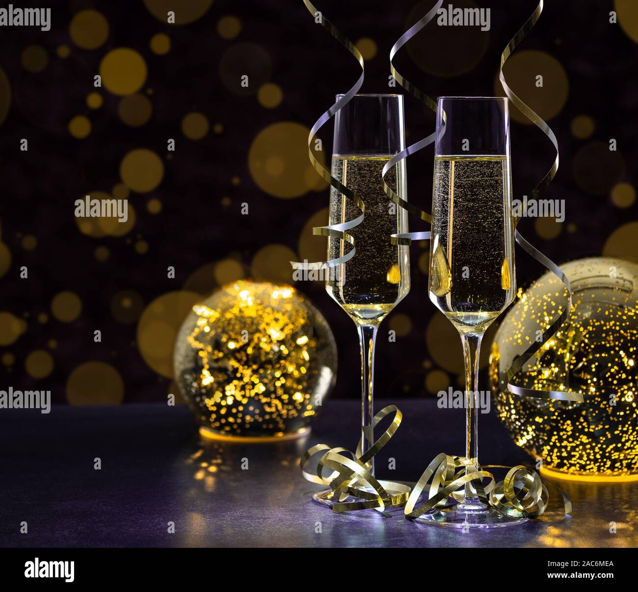 Two Glasses Of Champagne And New Years Eve Decorations With Copy
