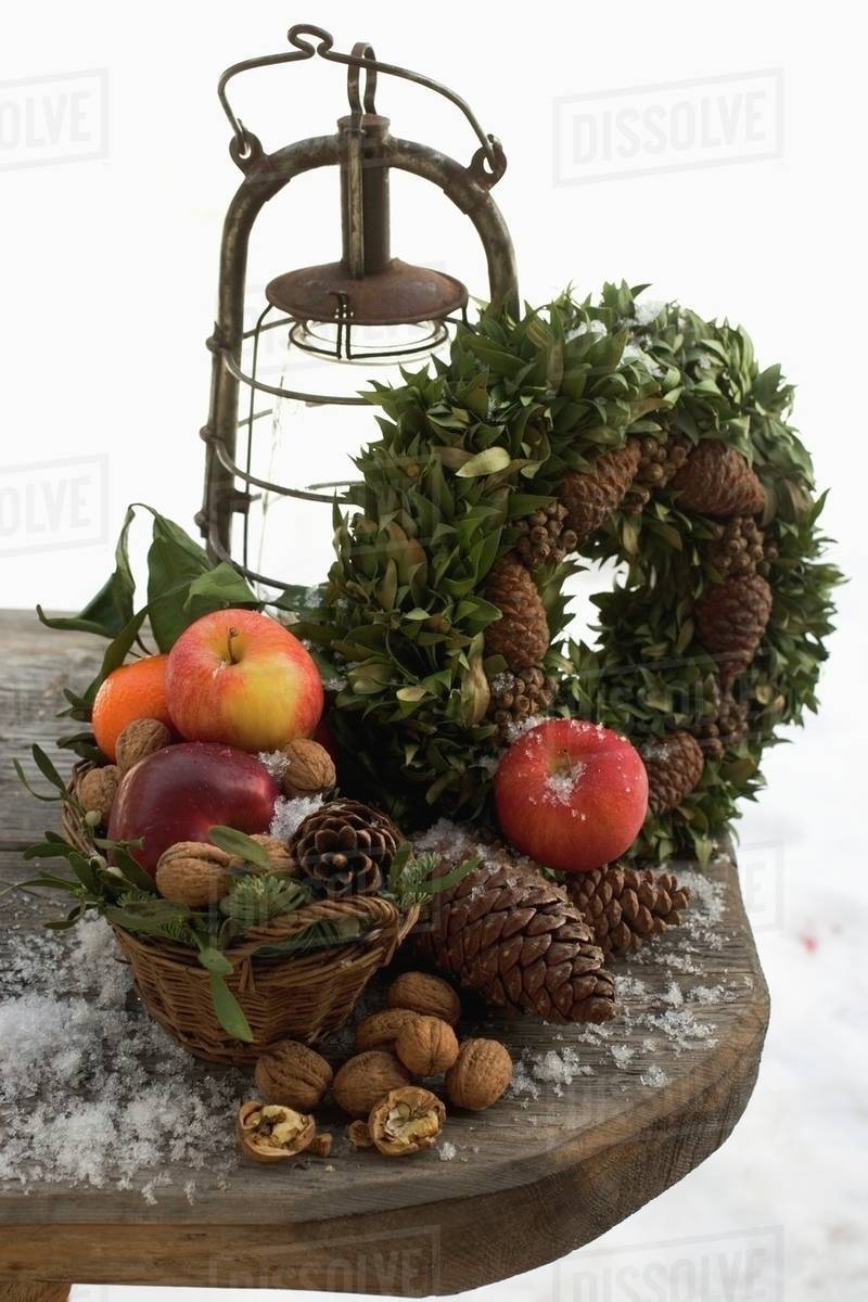 Rustic Christmas Decorations On Wooden Table Out Of Doors Stock