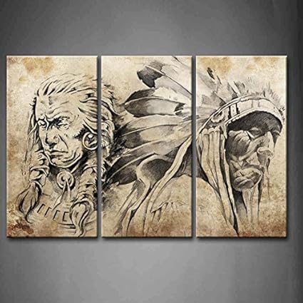3 Panel Wall Art Tattoo Sketch Of American Indian Warriors