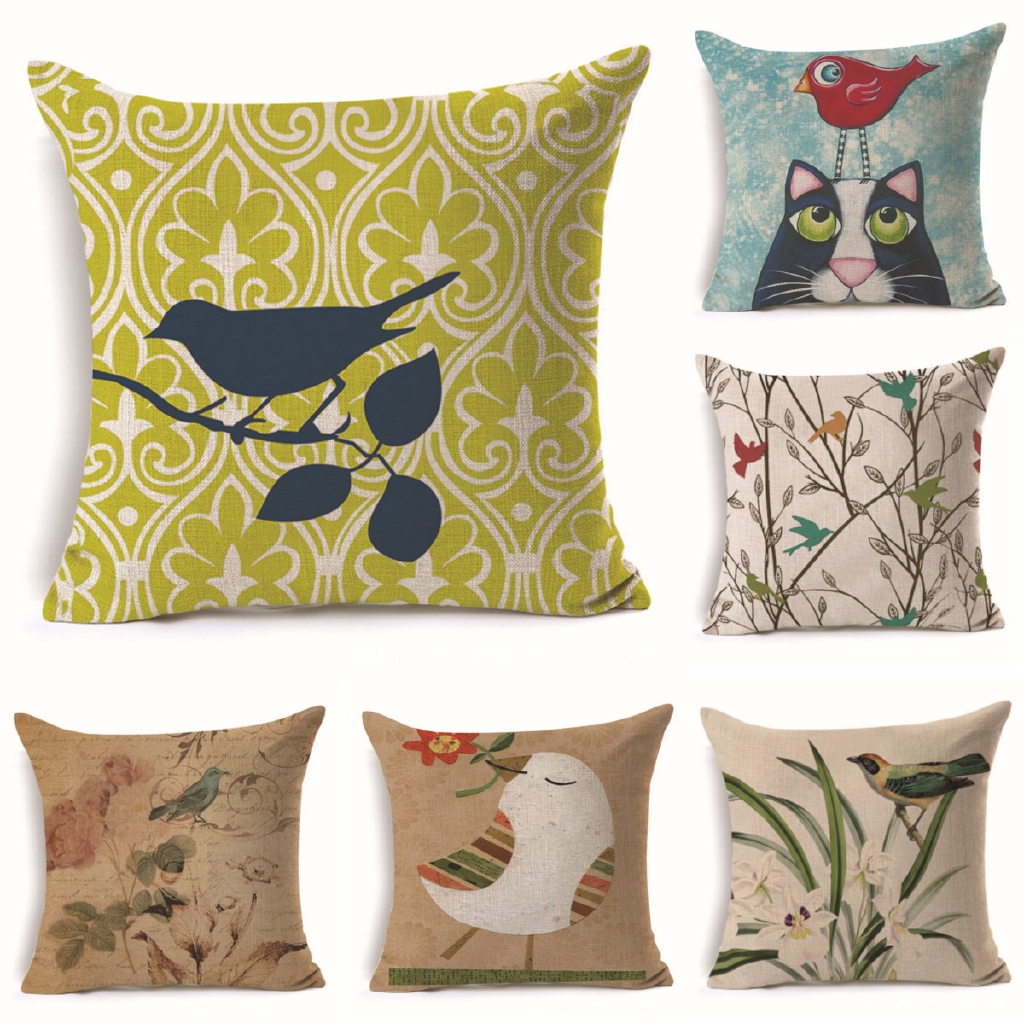 45x45cm Bird Flax Square Cushion Cover Pillow Case Sofa Vintage