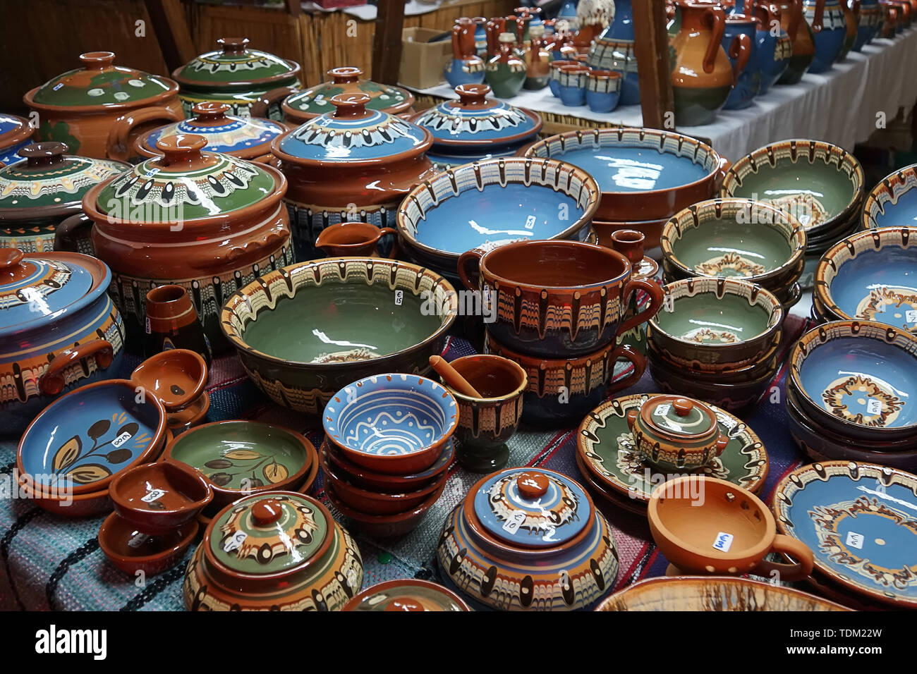 Many Decorative Dishes On The Counter At The Medieval Festival In