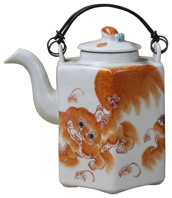 Handcrafted Porcelain Decorative Teapot With Orange Color Foo Dog