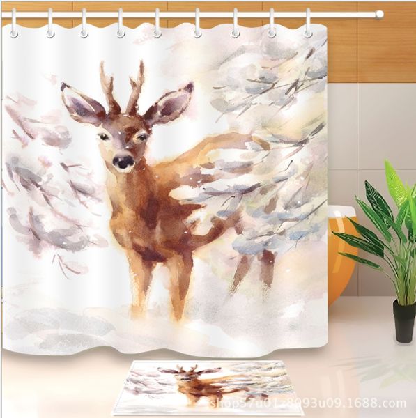 2019 Moose Shower Curtain Deer Family Snow Winter Design Horns