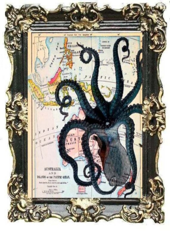 Navy Blue Octopus Vintage Map Octopus Print Octopus Decor Etsy