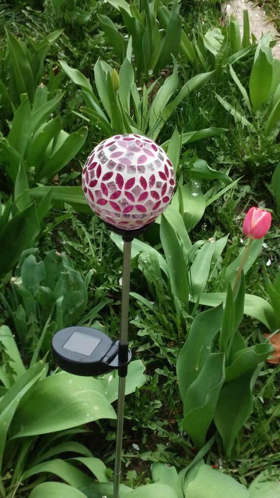 Solar Powered Garden Yard Decor Pink Mosaic Crackle Glass Ball Etsy